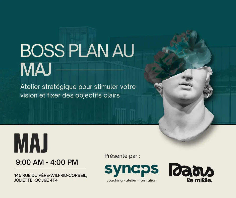 Au Musée d’art de Joliette, dans un environnement créatif qui stimule la réflexion et ouvre les perspectives, tu prends enfin le temps de penser à ton entreprise comme un·e dirigeant·e